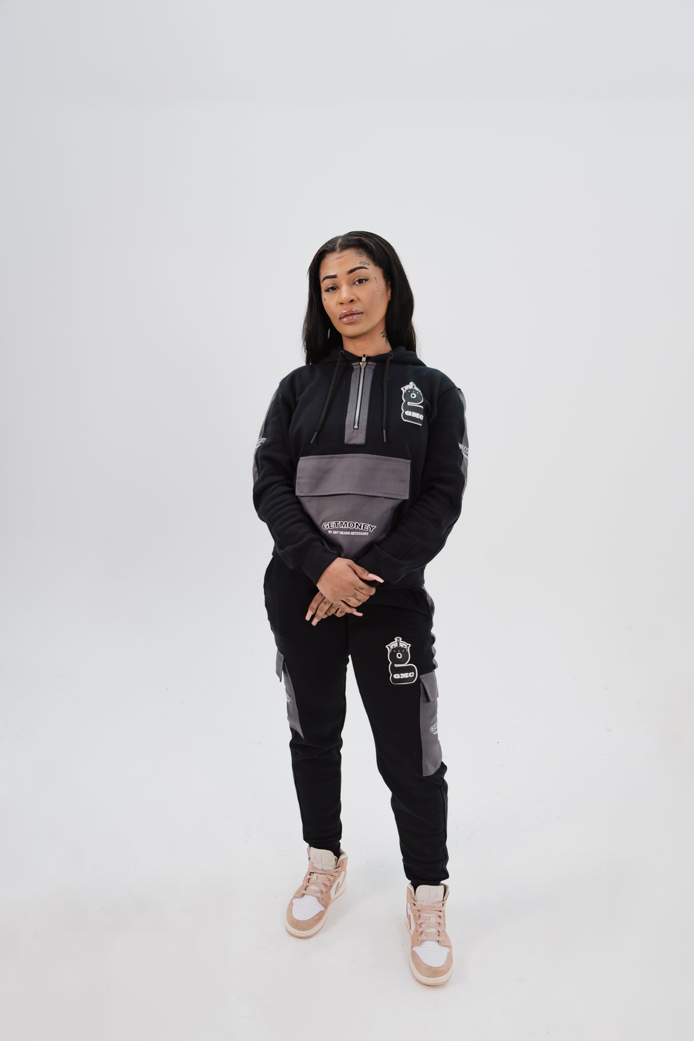 Premium black/grey tracksuit which features combat style side pockets and zipped hoodie with a pouch pocket.